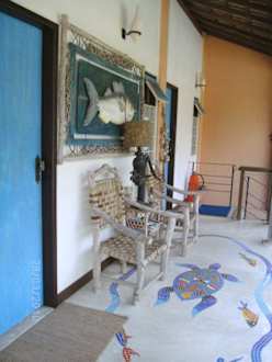 über eine Treppe kommt man zu den Zimmern mit Meerblick. Der Fußboden ist mit schönem Mosaik dekoriert, die Wurzelholzmöbel und die schönen Wohndekos laden zum Verweilen ein.
