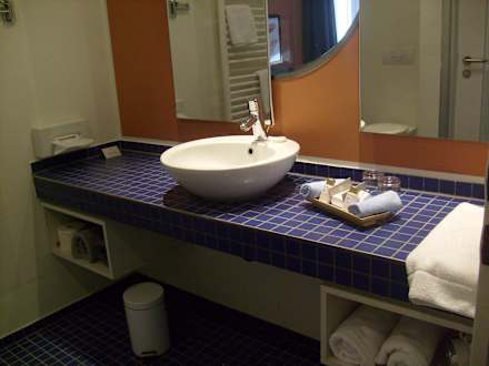 Bad originell, mit Ausblick ins Zimmerden Spiegel im Bad konnte man verschieben und hatte dann durch ein Bullauge freien Blick ins Zimmer