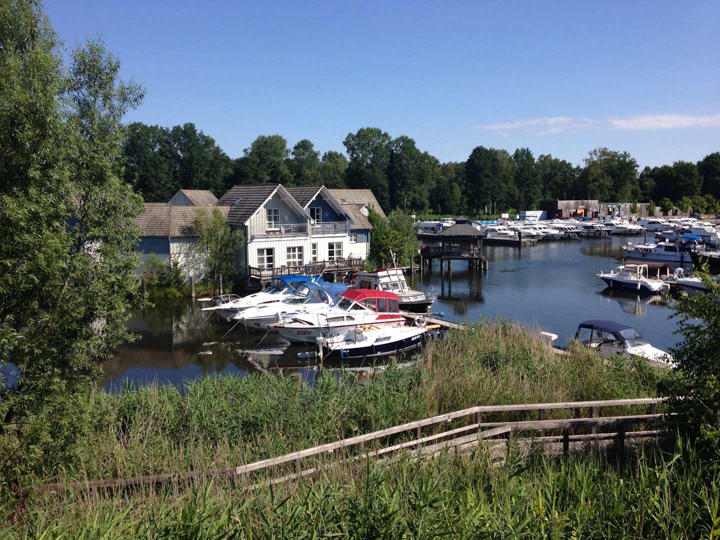 Unser Blick vom Ferienhaus auf den Hafen Precise Resort Marina Wolfsbruch
