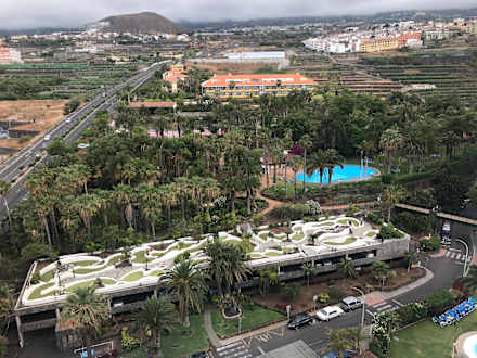 AusblickMinigolfanlage und der Mittlere Pool mit Bar. Oberhalb des länglichen Hauses ist der Lidl.