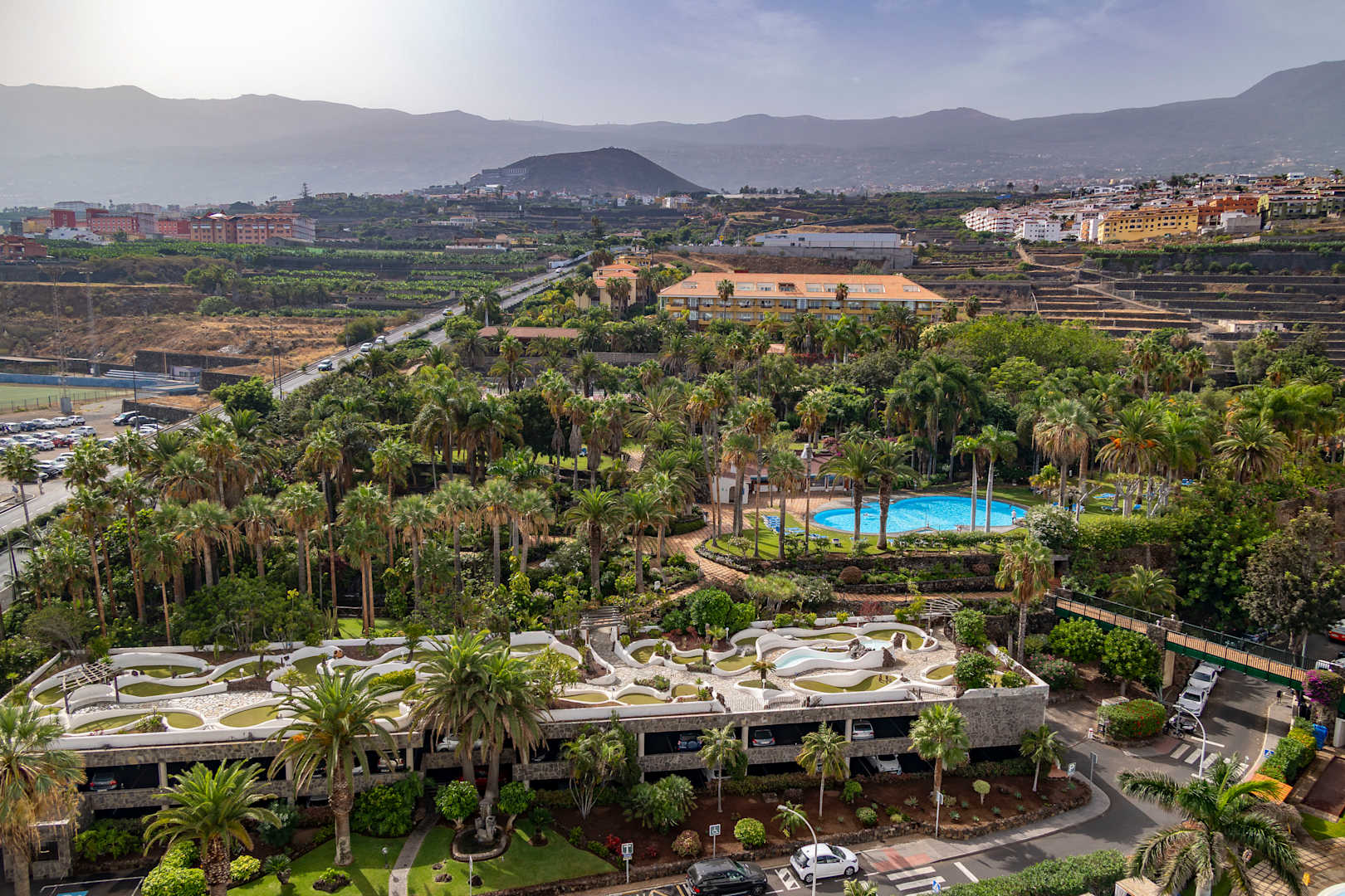 Über die Brücke rechts im Bild gelangt man in den Park der bis zu dem langen Haus mit dem roten Dach reicht. Im Park befindet sich dann der nächste Pool und einige andere Aktivitäten.