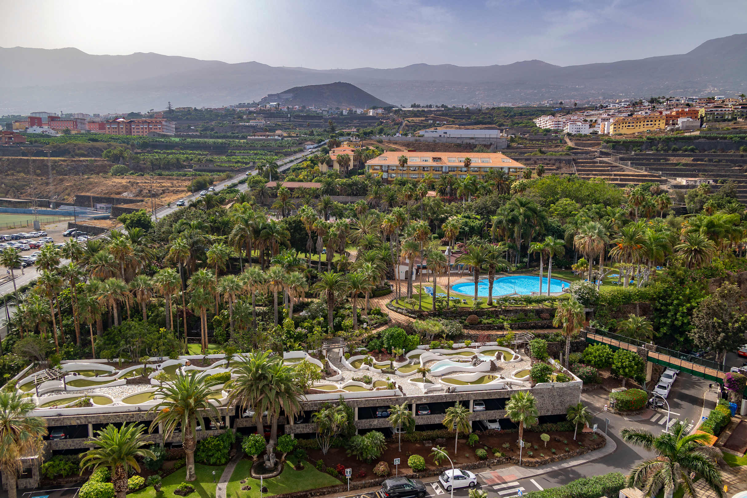 AußenansichtIm Vordergrund das Parkhaus mit der Minigolfanlage auf dem Dach.