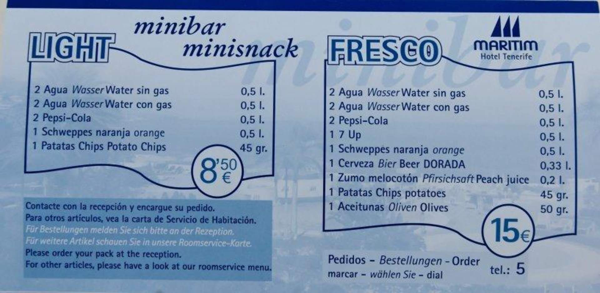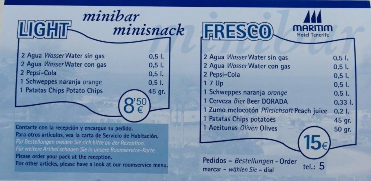 Preise Minibar"Paketpreise" für die Minibar.