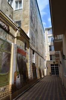 Eingang des Hotels. die Lobby ist hinter der Glastür am Ende vom schmalen Weg.