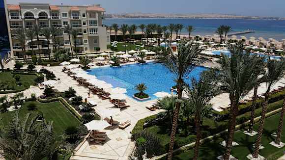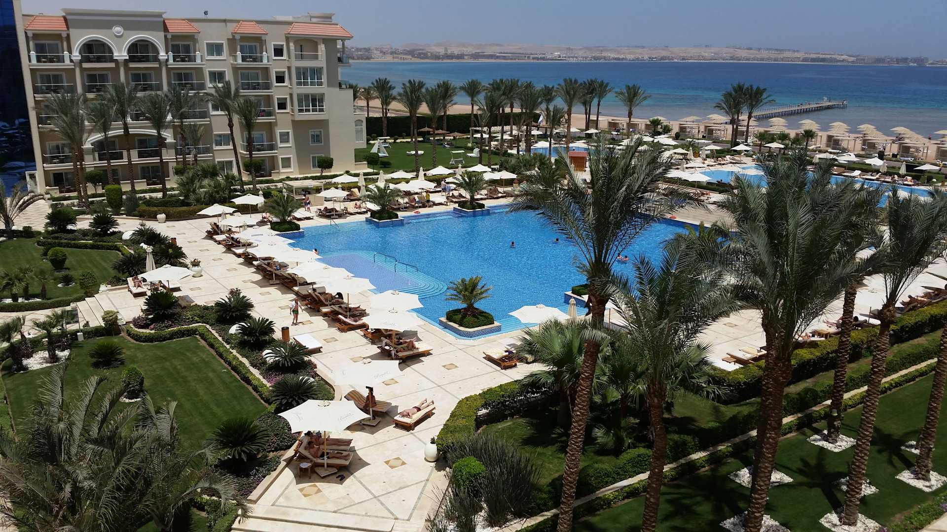 Blick über Pool und Meer nach Sal Hasheesh Premier Le Reve Hotel & Spa