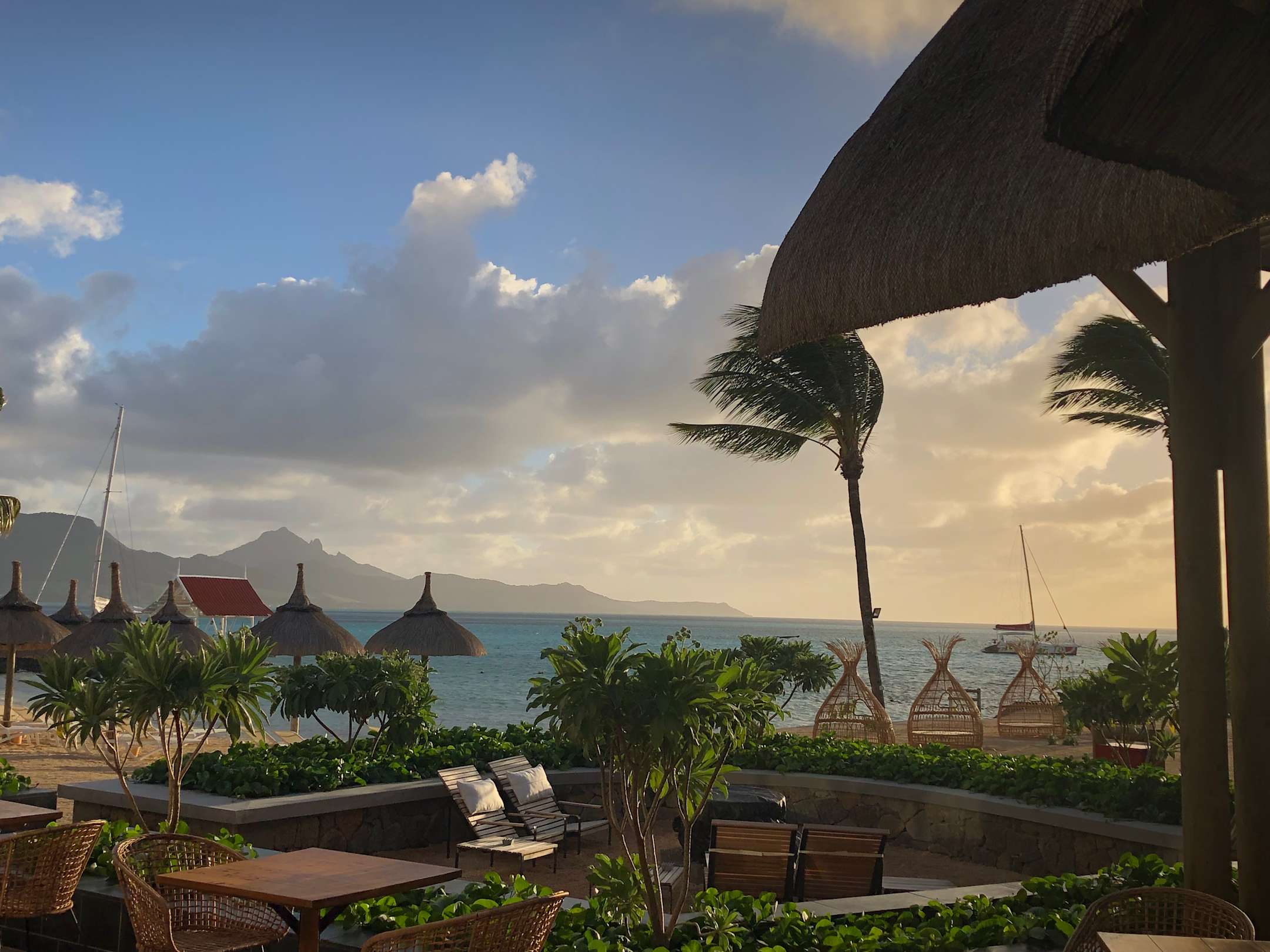 Blick von der Hotelbar auf den Pool- / Strandbereich