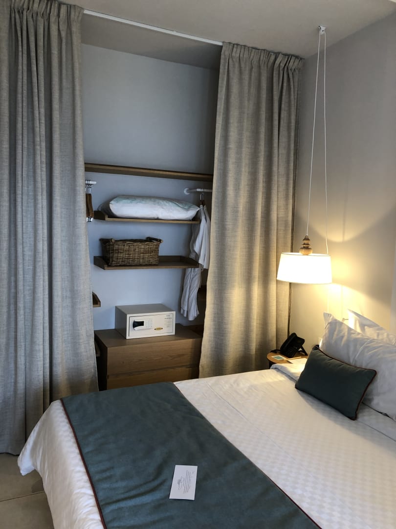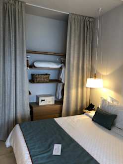 Doppelbett und offener Schrank (Vorhang) im Familienzimmer
