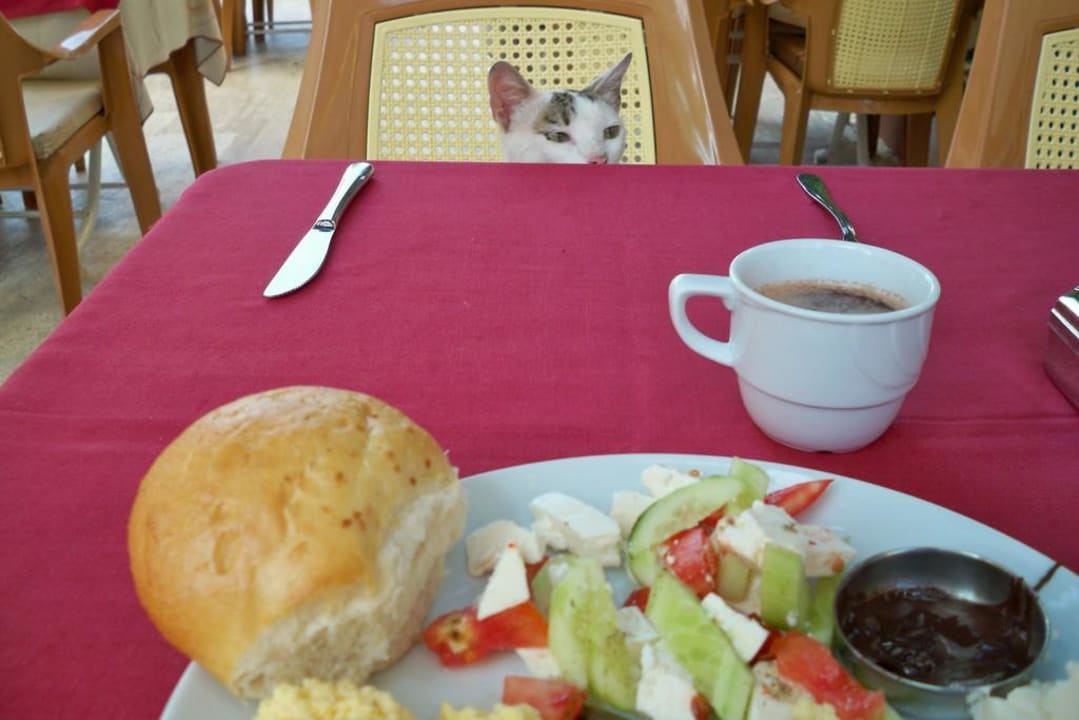 Frühstückstischauf dem Hotelgelände waren immer drei vier Katzen, die auch zu den Mahlzeiten um die Beine schlichen... die einen gaben ihnen was zu essen, die anderen haben sie verscheucht... aber ein kleines bisschen nervig waren die Katzen beim Essen schon....