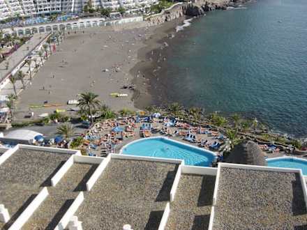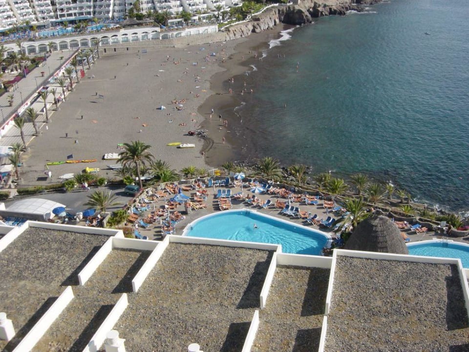 Blick auf den Strand und einen Teil der Poolanlage