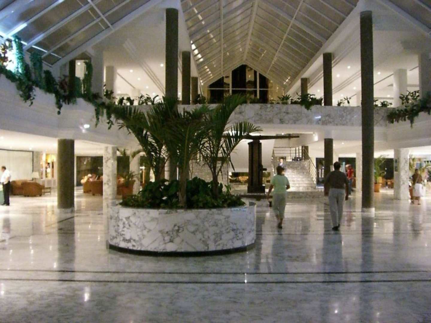 Sehr anspruchsvoller Eingangsbereich. Vom Bild rechts aus gesehen geht es Richtung Bar und Rezeption. Nach links geht es zum Pool und Speisesaal. Die Treppe hoch zum Saal für die Abendveranstaltungen.