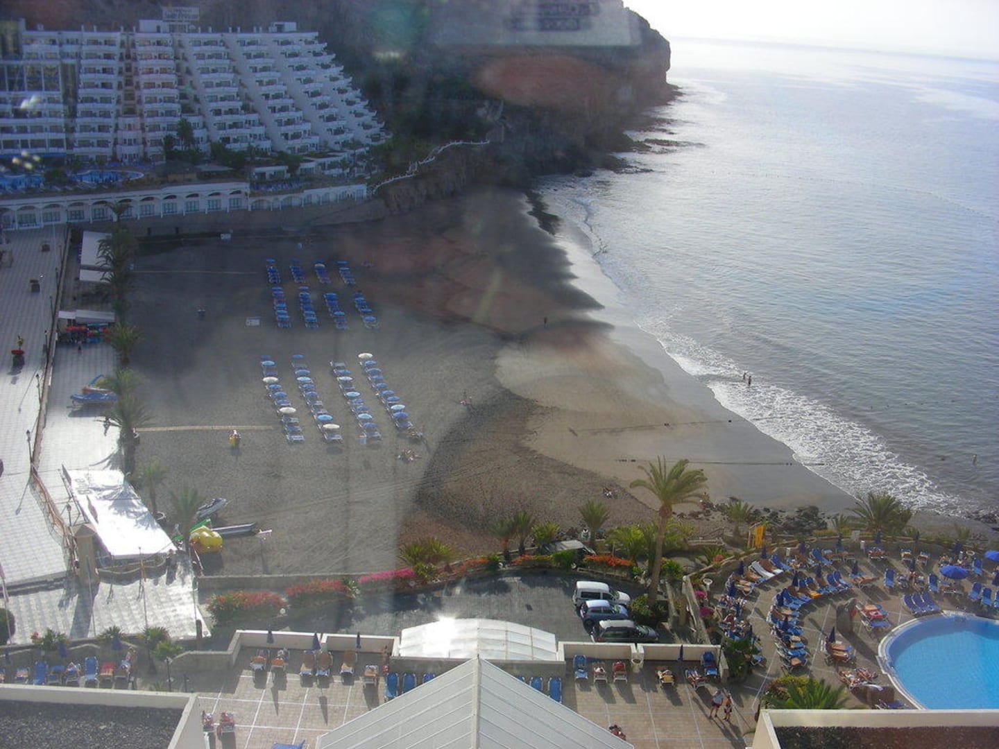 Blick aus dem obersten Stockwerk des Hotels Taurito Princess. Im Hintergrund das Schwesterhotel Suite-Princess, das von der Morgensonne übrigens nichts abbekommt.