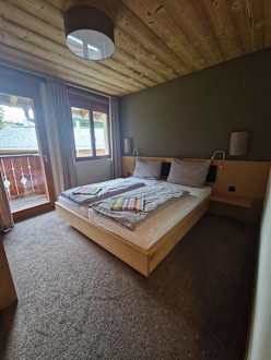 ZimmerDoppelzimmer mit Balkon. Hat Teppich am Boden welcher aber flauschig ist. Schrank mit Fächern und Kleiderhacken für die Kleidung.
