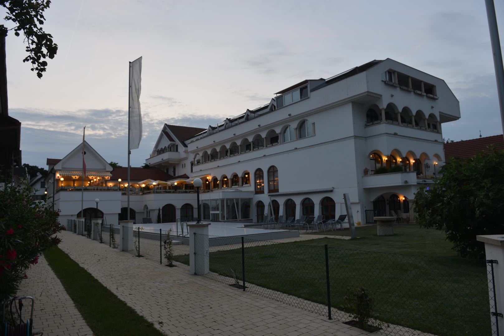 AußenansichtSommerabendstimmung mit dem schönen Pool im Vordergrund und die beleuchtete Hotelterrasse!