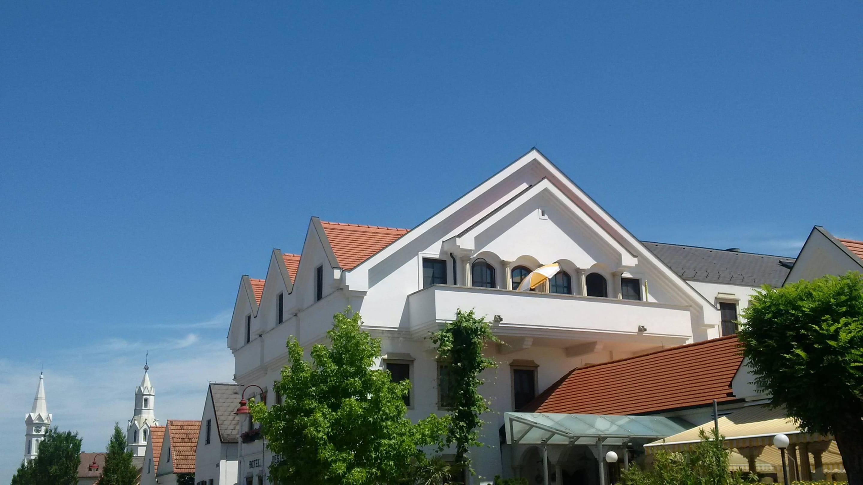 Von der Straße, links oben Balkon Zimmer 25