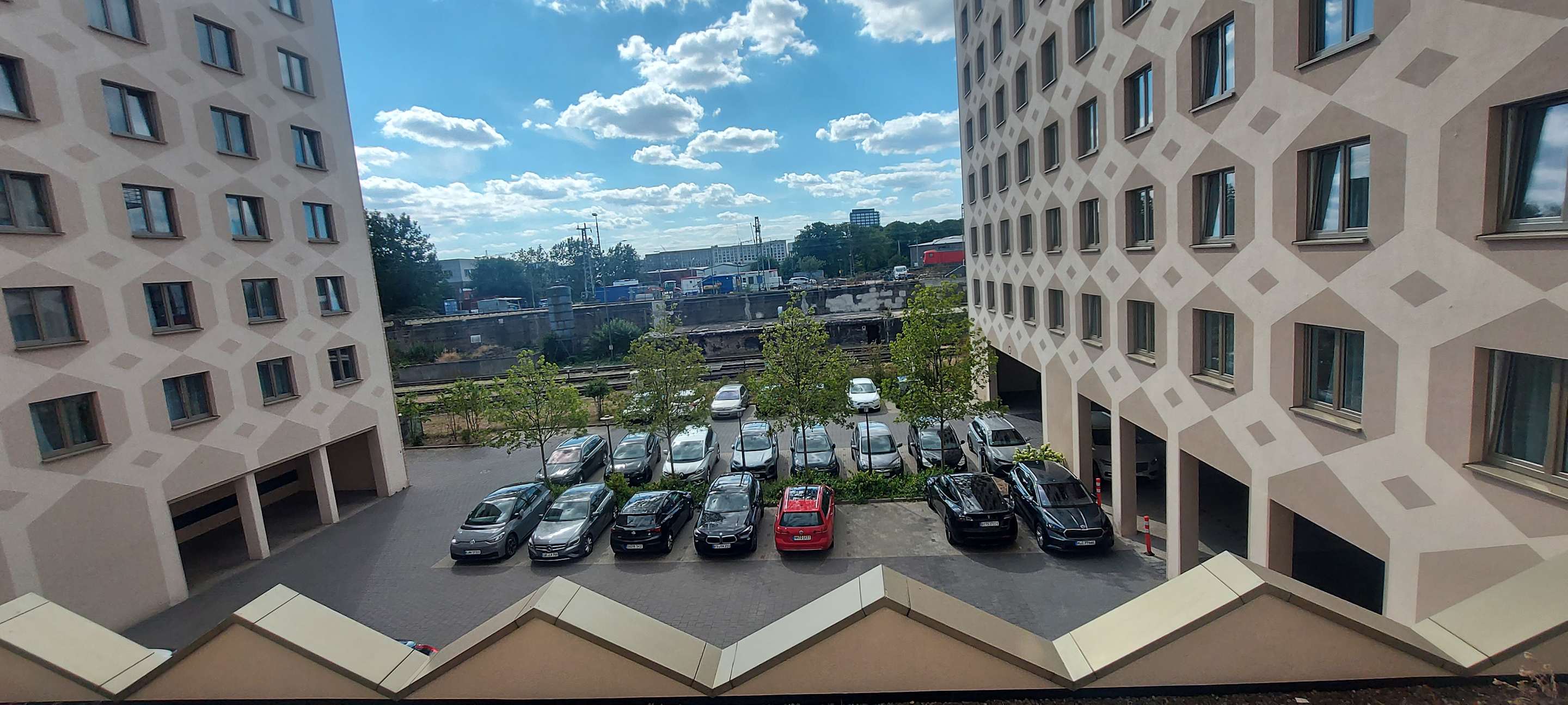 Blick vom Zimmer 225 auf den Parkplatz und dem Güterbahnhof