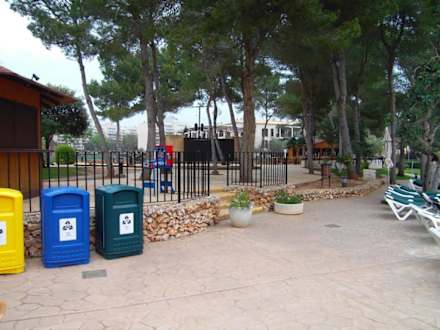 Es wird Müll getrenntIm Hintergrund die kleine Außenbühne und ein Automat, an dem Kinder für 1 EUR Flummis kaufen können ...