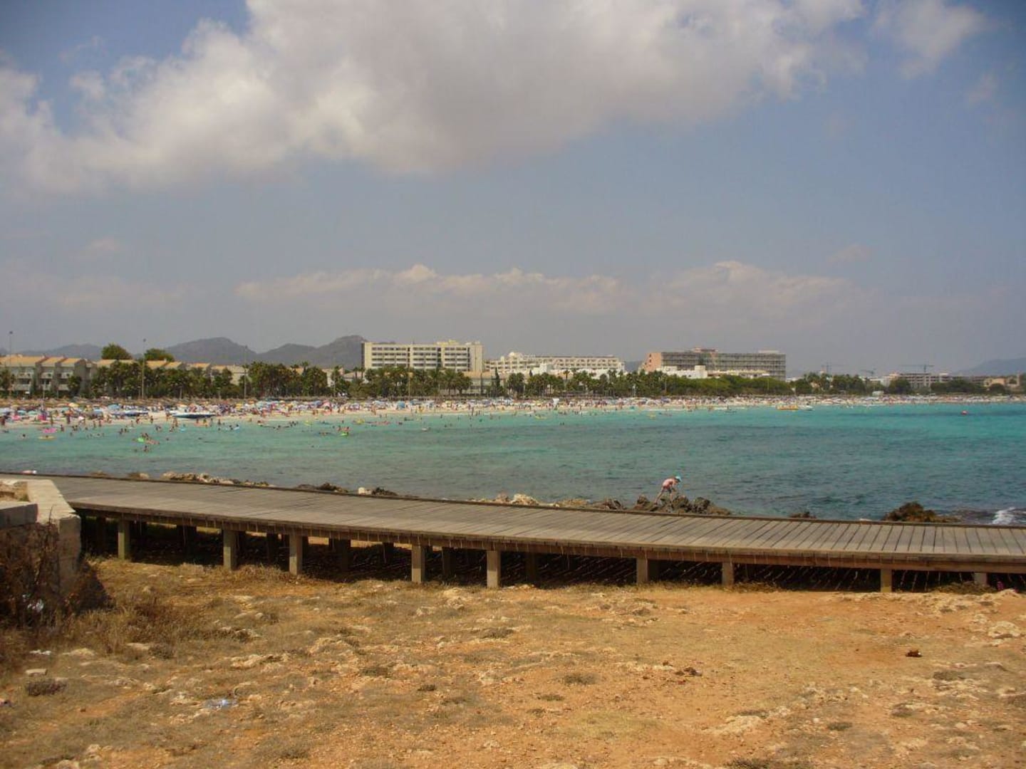 Blick auf den Strand von Sa Coma und im Hintergrund einige große Hotels.