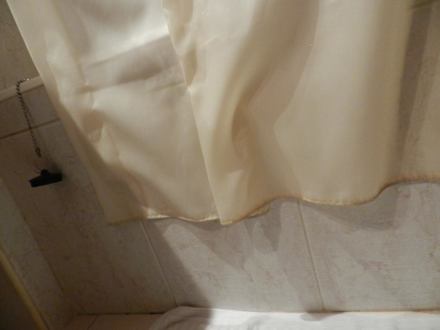 BadezimmerSchmudeliger Duschvorhang an der Badewanne, sollte schnellstmöglichst durch eine Duschwand ersetzt werden.