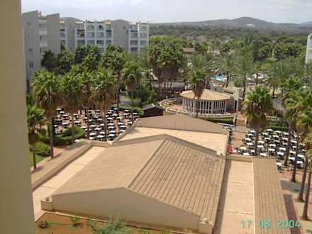 Hier sieht man die Aussicht aus dem Panoramafenster des 5.Stockes.Man sieht den Pool, die Poolbar(mitte), und den hinteren Teil der Bühne.(Datum stimmt nicht!!!)