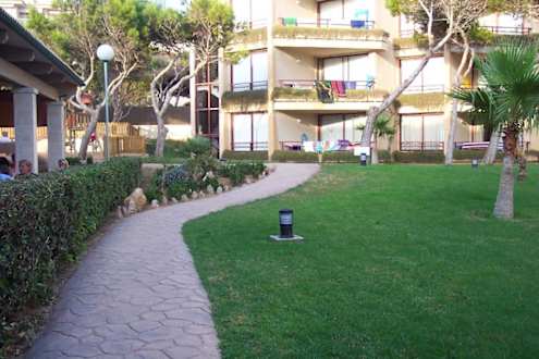 Grünanlage im Hotel Turo PinsWeg zu den hinteren Blocks, zum Kinderspielplatz und links angrenzend der Essensbereich....