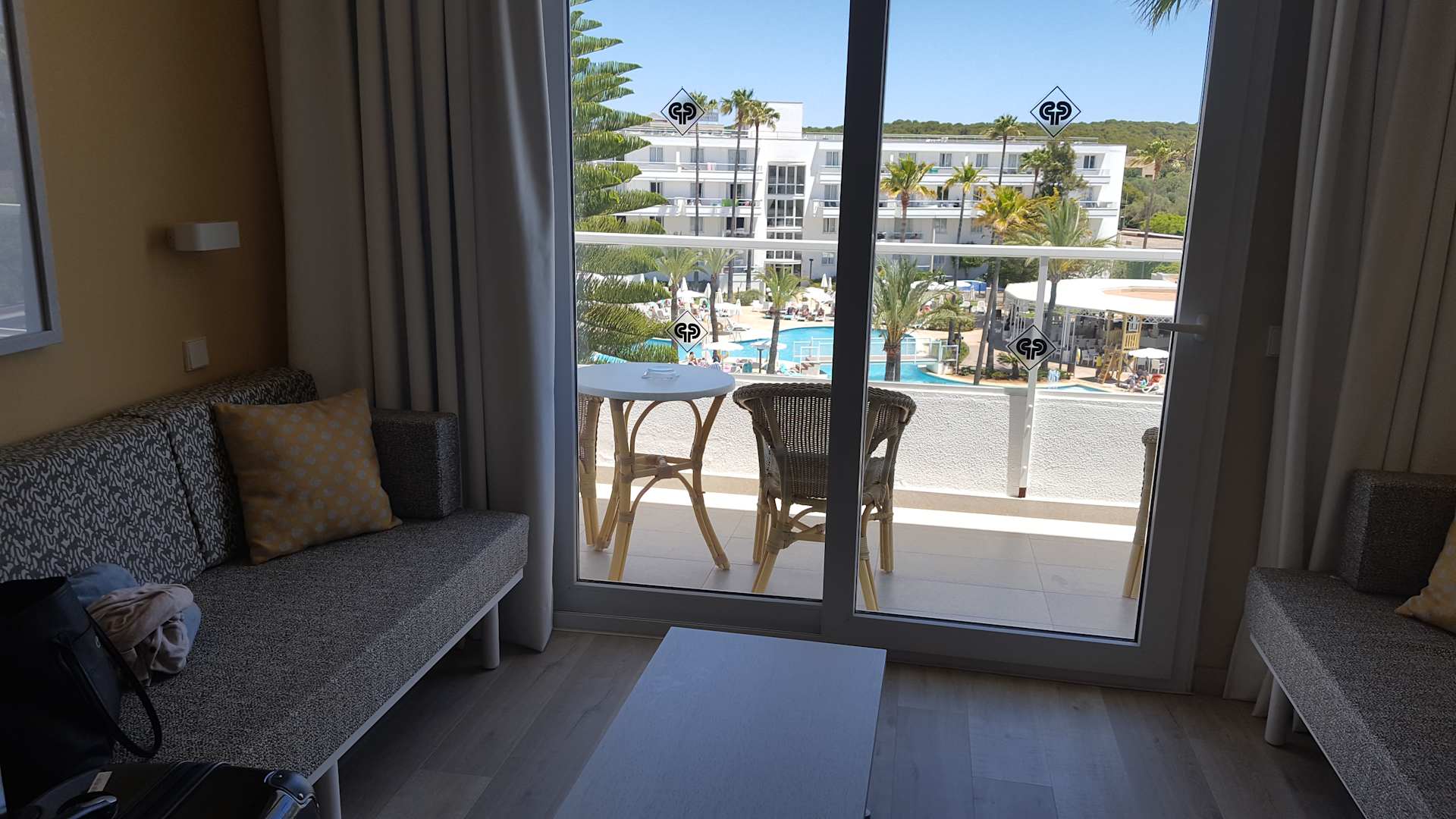 Blick vom Zimmer auf Balkon und Pool