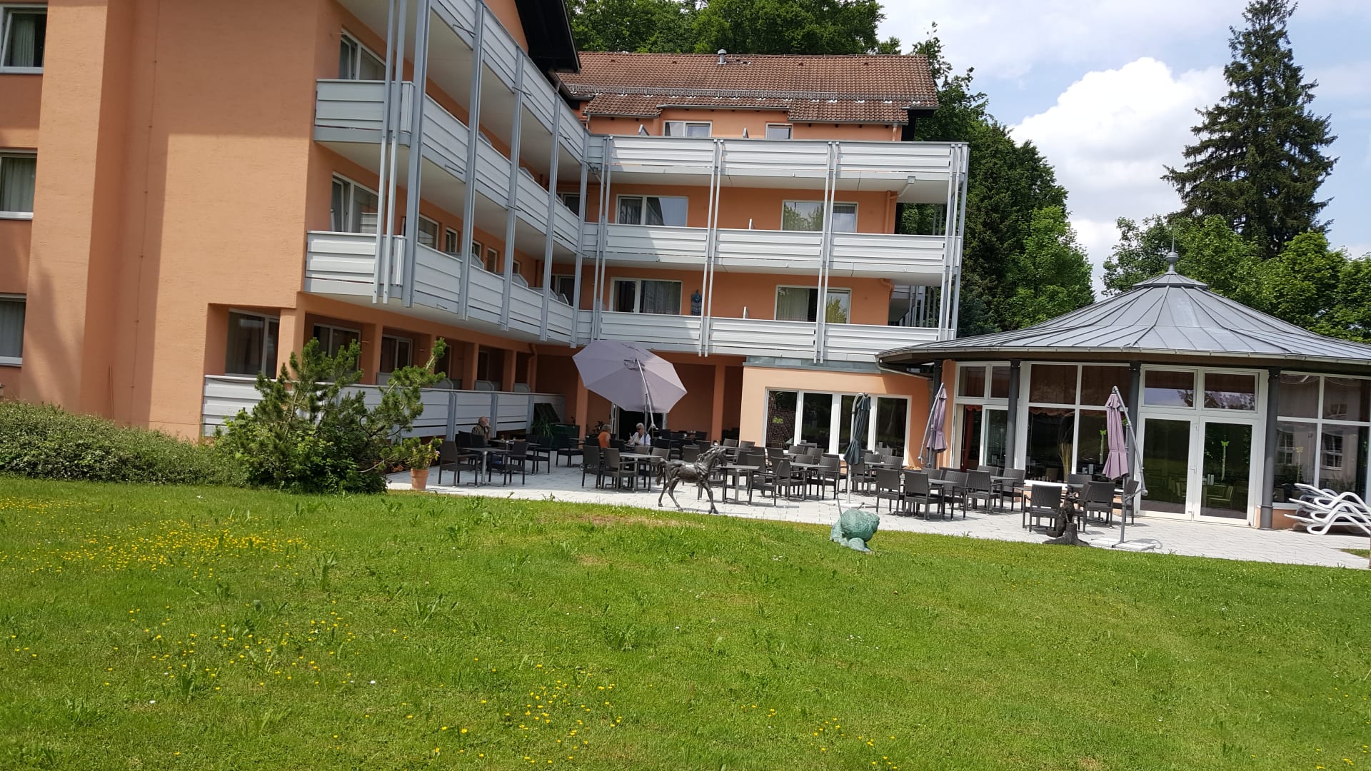 Die Terrasse des Hotels mit Wintergarten
