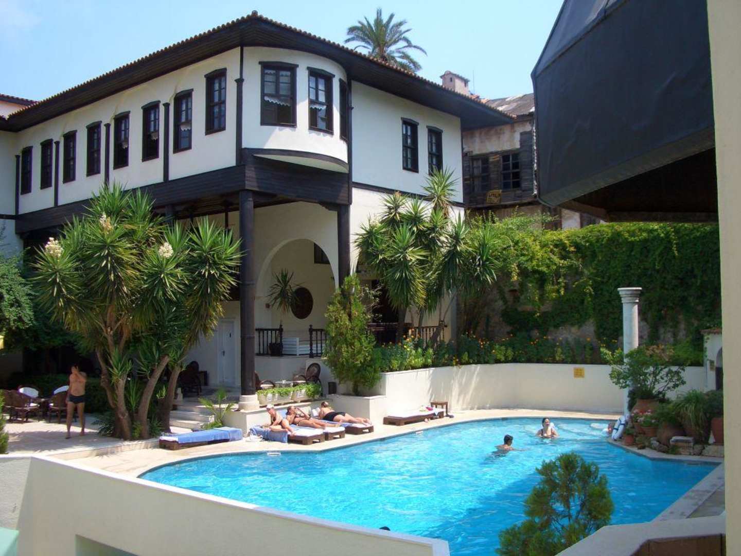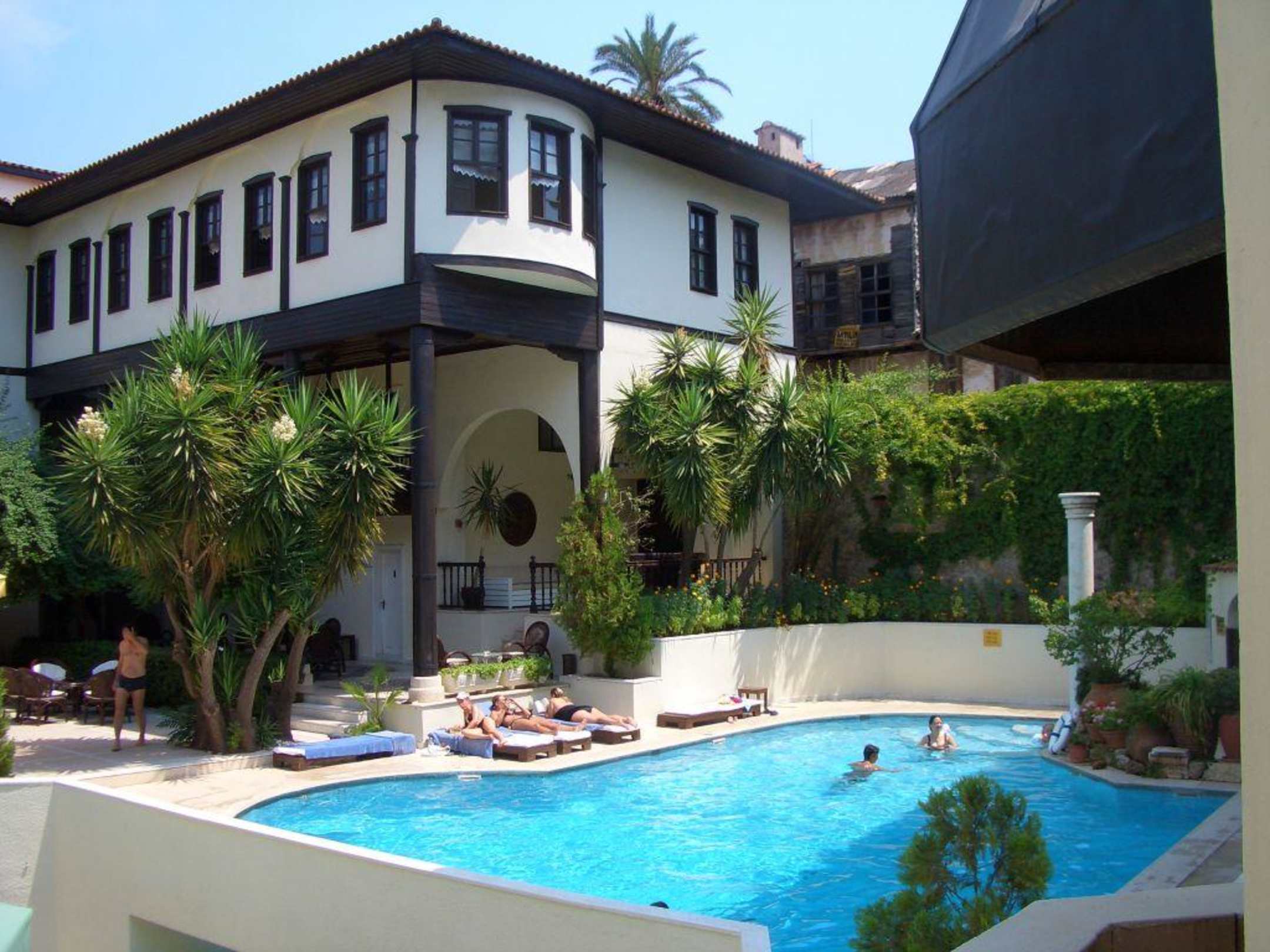 Das Bild zeigt den Pool und ein Gebäude des Innenhofs. Rechts im Vordergrund befindet sich ein Kamin. Zwischen Kamin und Pool steht der Behälter für die Strandhandtücher.