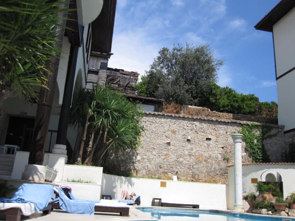 Links und Rechts im Bild sieht man die Ränder von 2 der 3 Häuser die zum Hotel gehören.