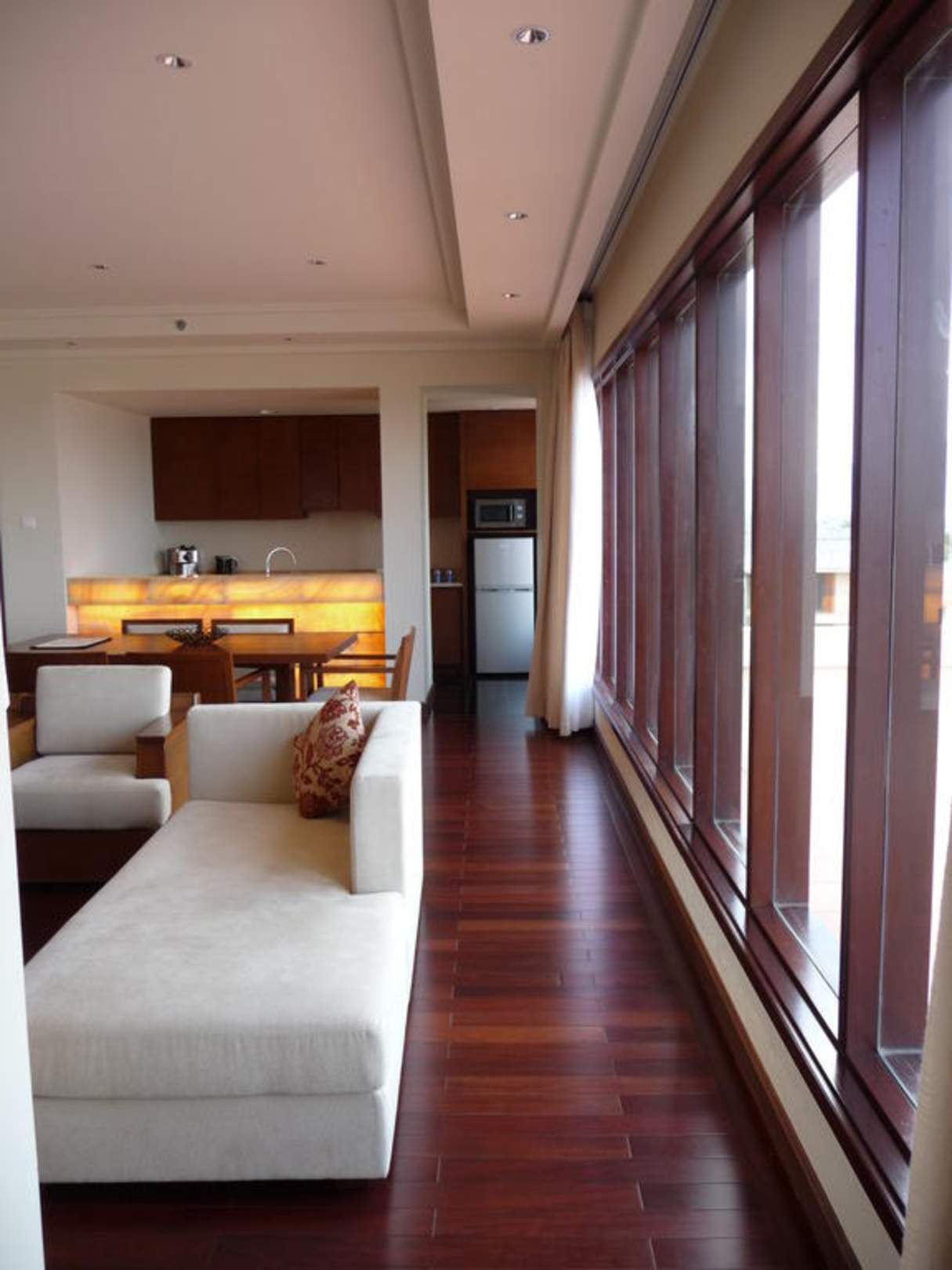 Vom Schreibtisch im Wohnraum sind es ca. 10 m bis zum Kühlschrank imKüchenbereich am Ende des Raumes. Man sieht eine Couch der Sitzgruppe.
