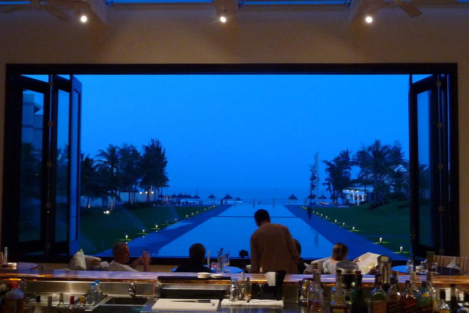 Zur 'Blauen Stunde' der Blick aus der Lobby-Bar Richtung Meer. Man kann es wirklich kaum glauben, das Blau ist nicht 'frisiert'; kurze Zeit am Abend sieht es wirklich so aus.