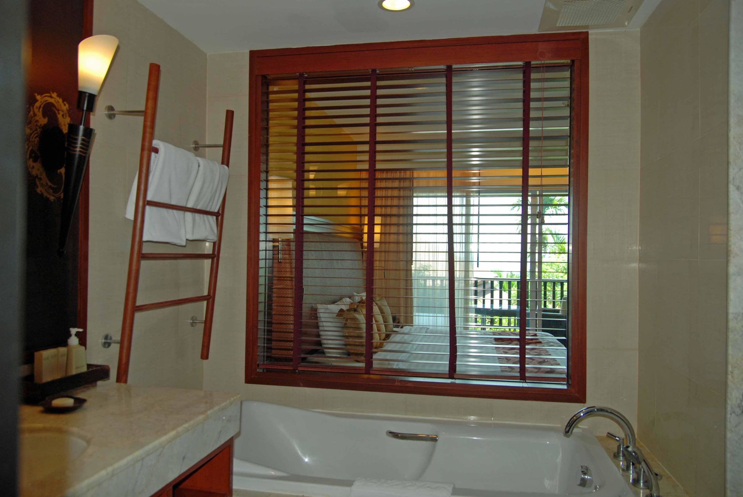 Bad mit Ausblick auf Zimmer und Balkon