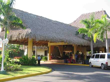 Empfangshalle des Punta Cana Princess, in dem sich u.a. Rezeption, Lobby-Bar und Internet-Ecke befinden. Offene Bauweise mit Palmendach.