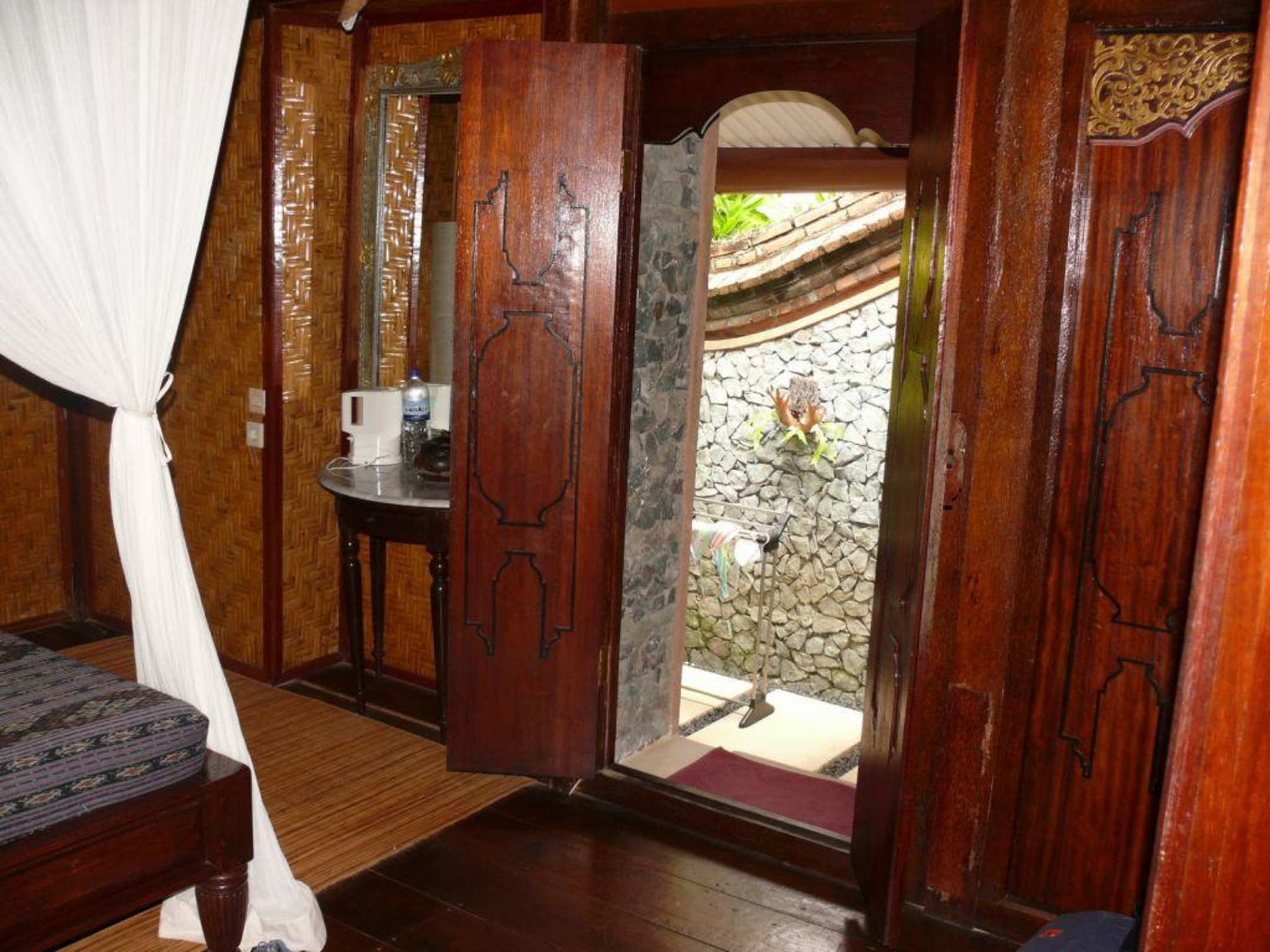 Schlafraum mit Tür zum Open Air Bad
