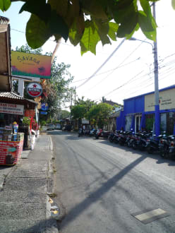 Die Straße vor dem Hotel mit vielen kleinen Läden