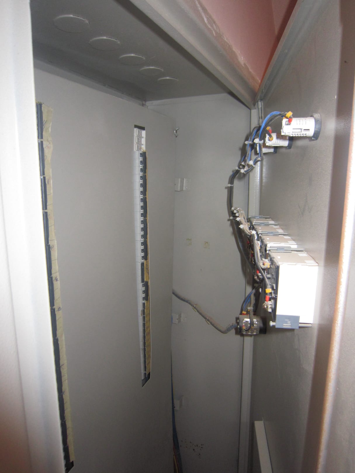Treppenhaus mit offenen Stromkästen.