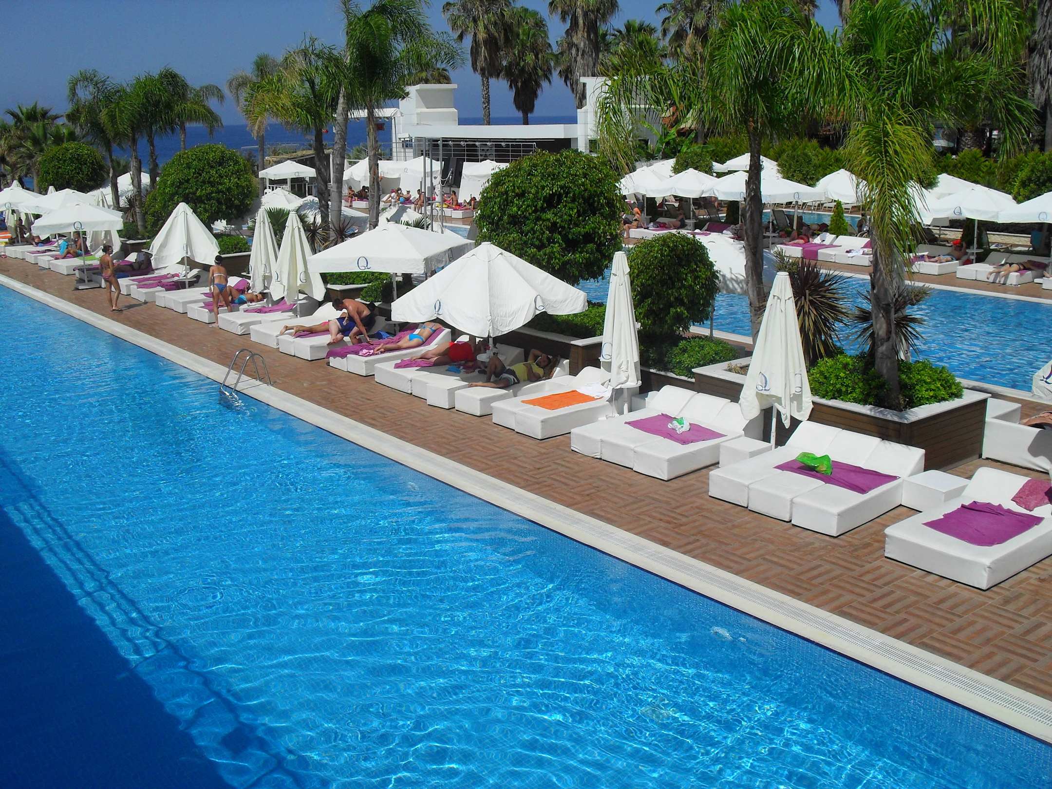 Hier sieht man beide grosse Poolbecken mit Liegen und Schirmen.