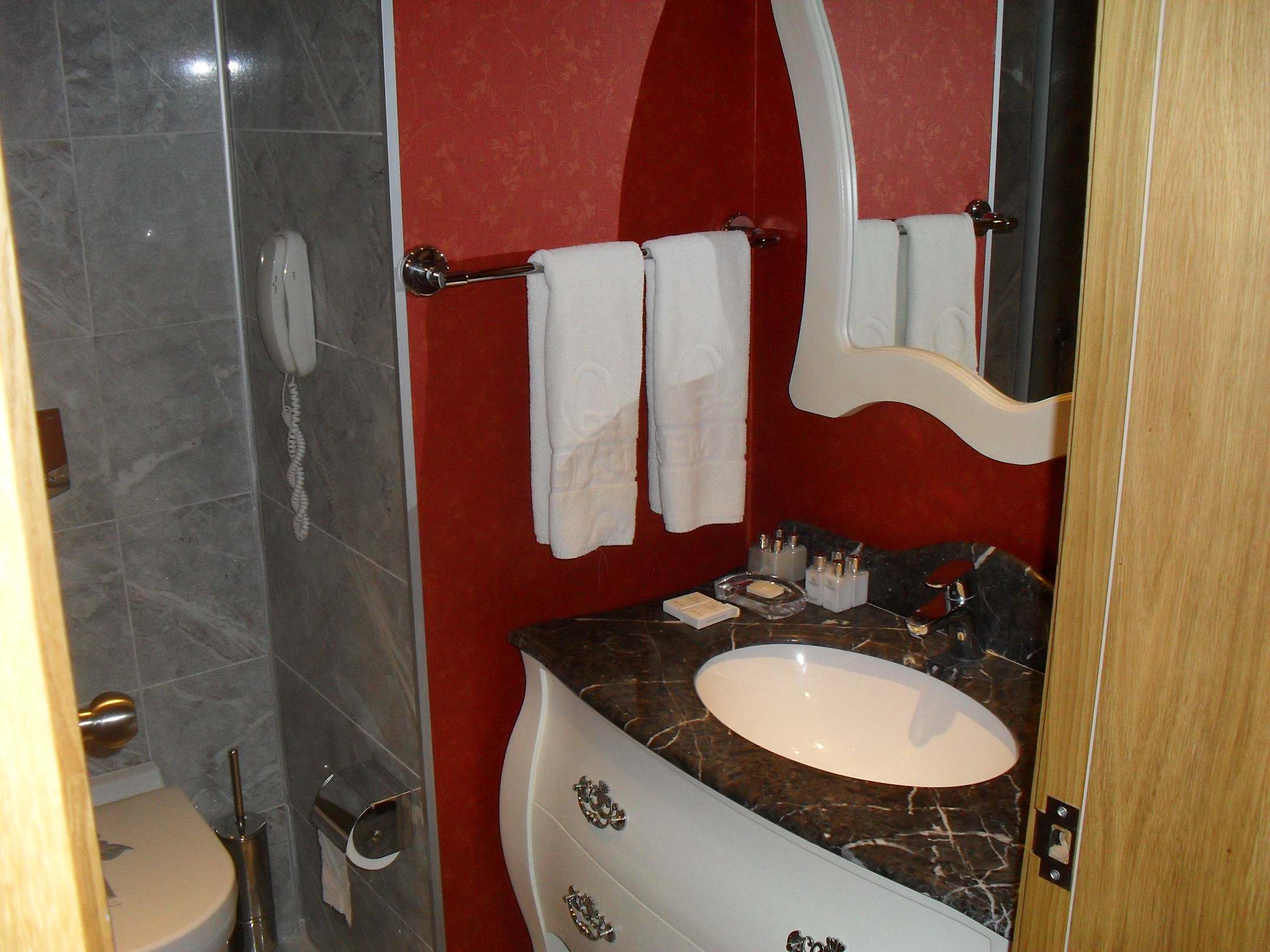 BadDer Waschtisch mit Mamoroptik und den vielen Hyhieneartikeln des Hotels. An der Wand das zweite Telefon des Zimmers.