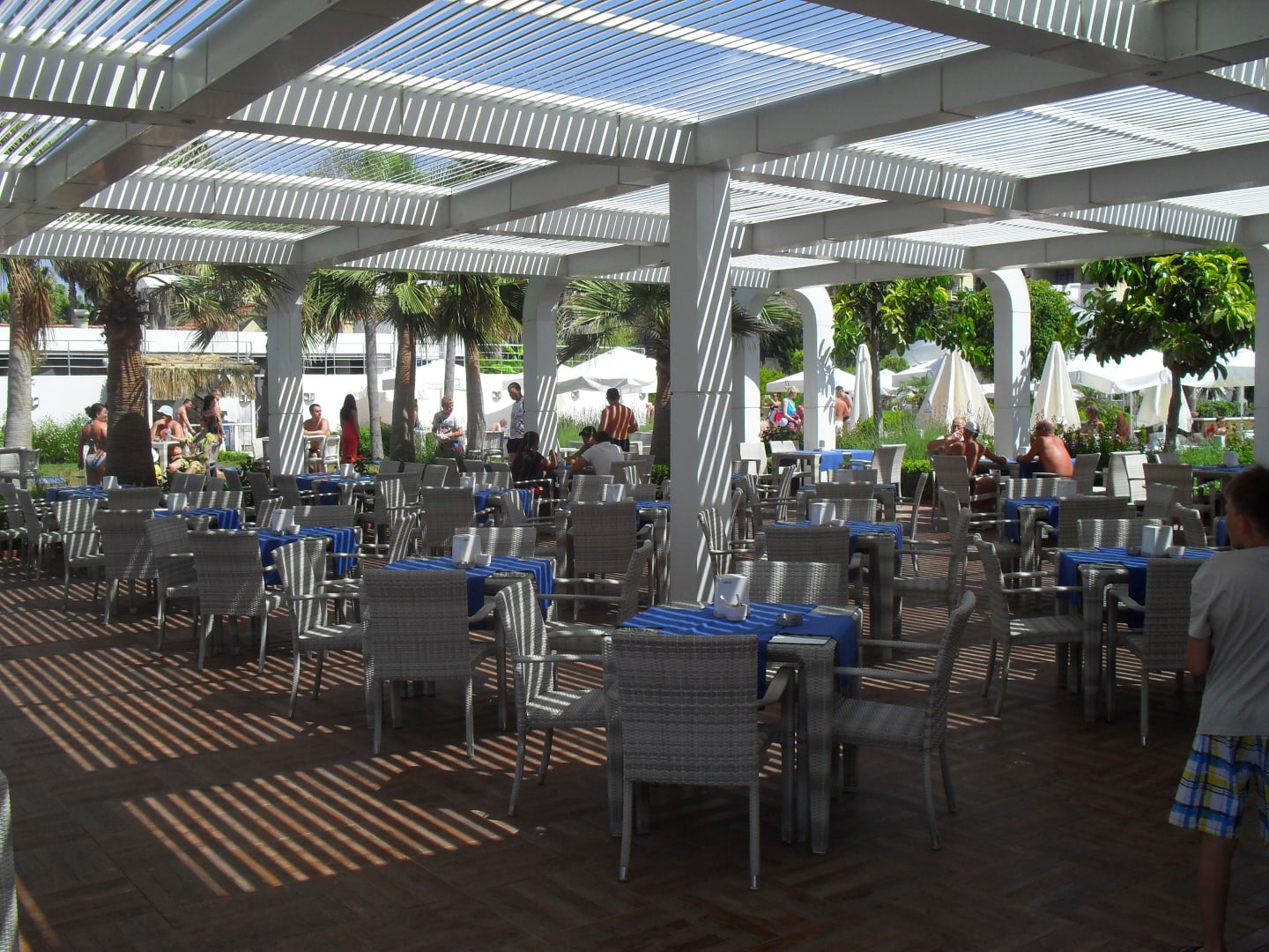 StrandbarStühle und Tische in der Strandbar des Hotels. Rechts befindet sich nach 10 Metern der Strand, im Hintergrund sieht man die Pools.