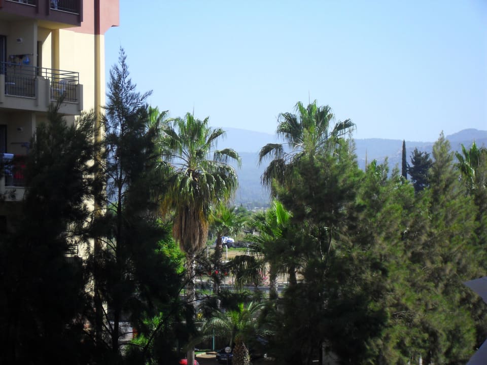 Hier der Blick von unserem Balkon in die andere Richtung. Man sieht die Berge durch die Palmenanlage. Dazwischen verläuft die D400. Die Fahrgeräusche haben wir aber nicht wirklich wahrgenommen.