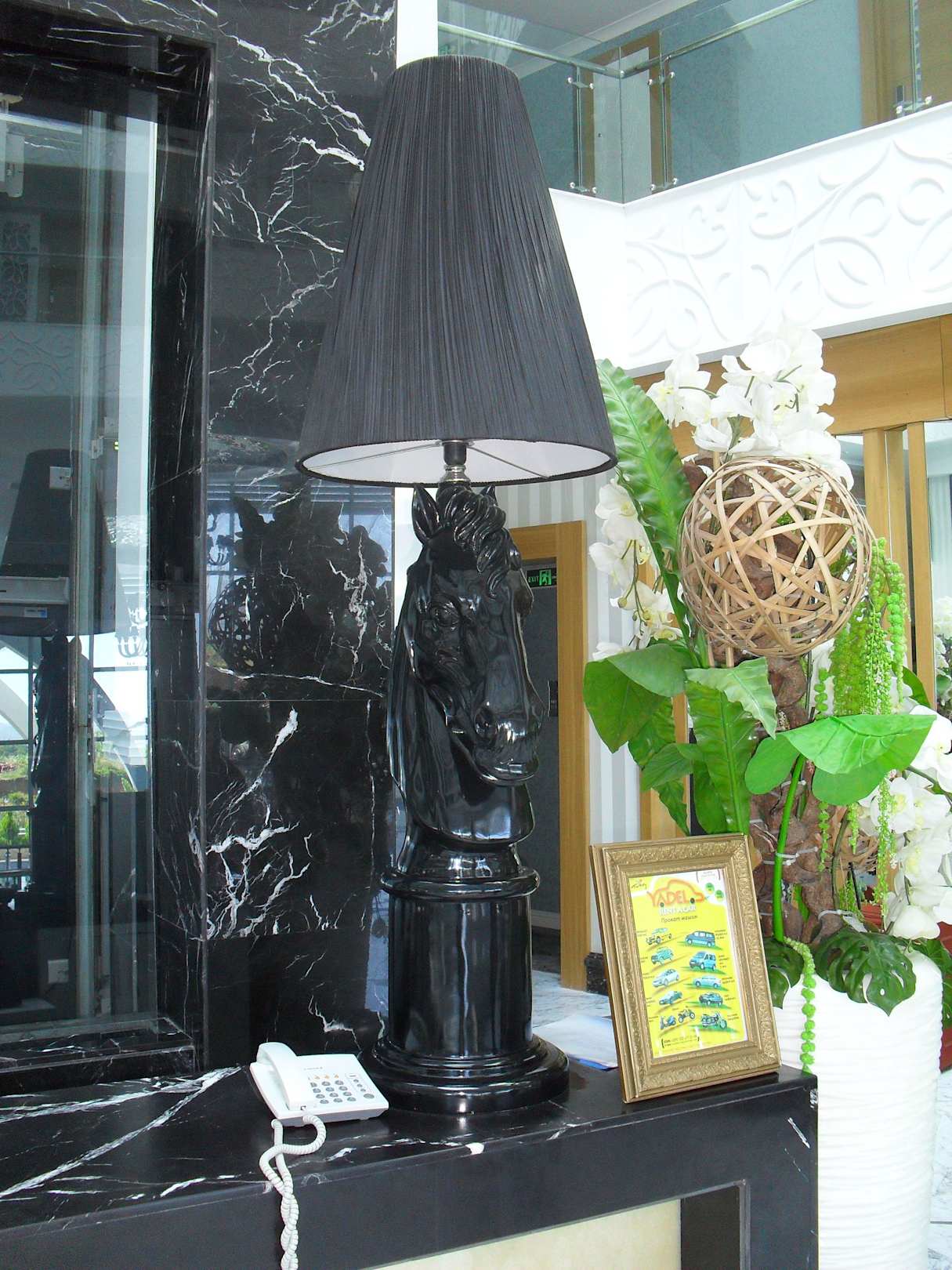Lampe bei der RezeptionEine tolle Lampe in Pferdeoptik, die an der Seite der Rezeptionstheke ihren Platz hat.