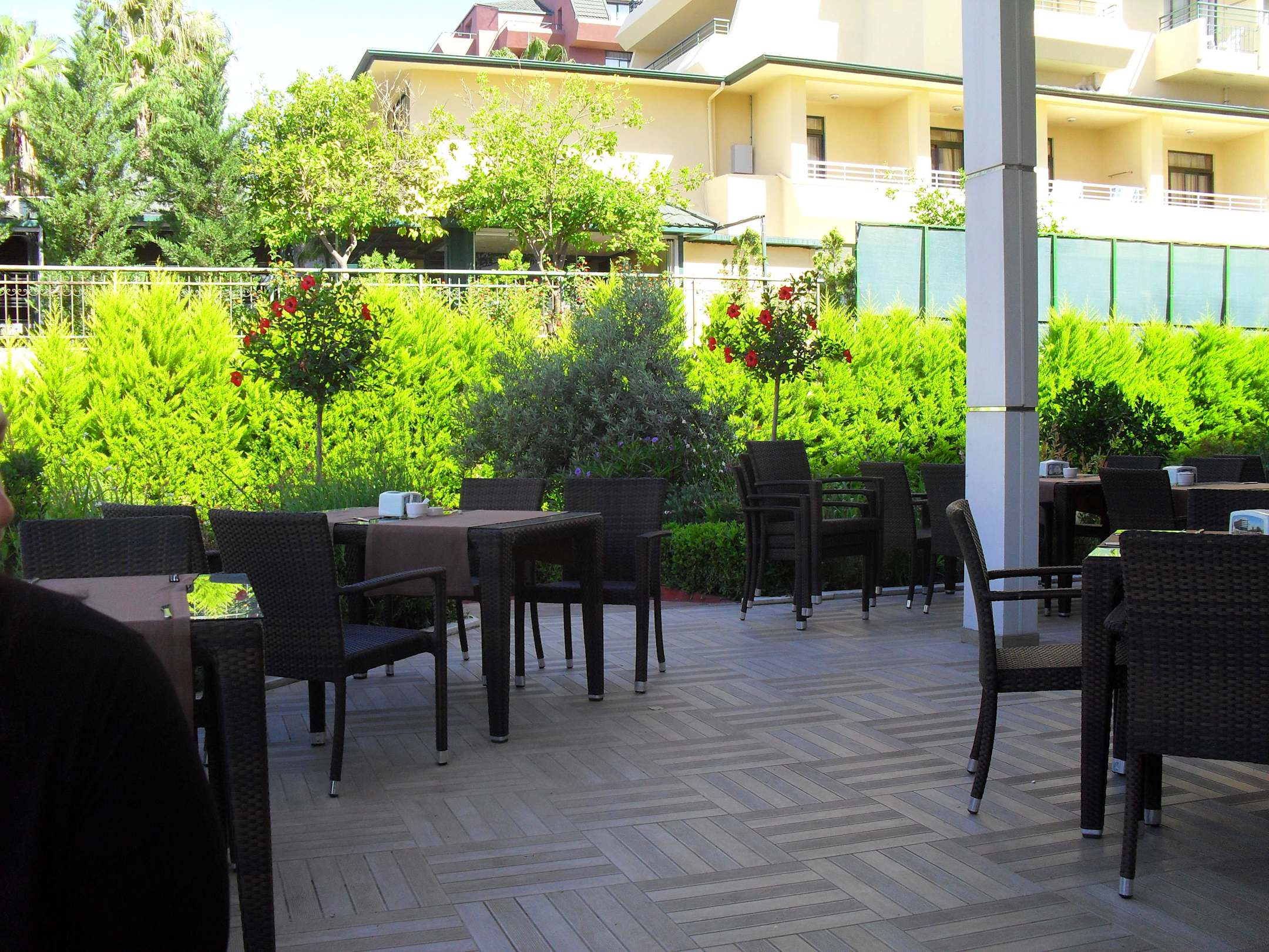 Restaurantterrasse Ein anderer Blick auf die Restaurantterrasse mit Blick zum nächsten Hotel und den tollen Gartenanlagen.