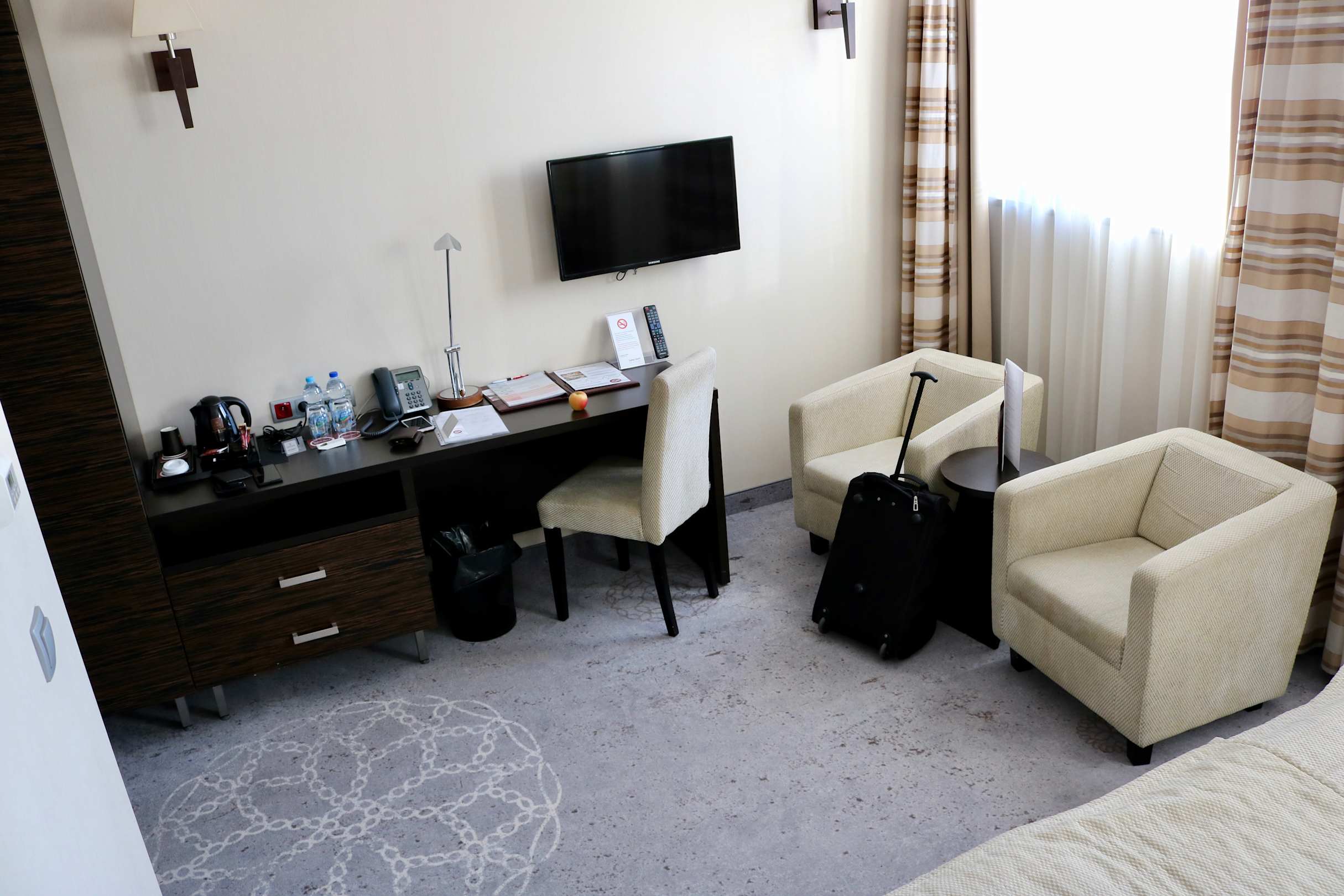 Bereich des Zimmers gegenüber des Bettes; links davon Badezimmer sowie Ausgang.
