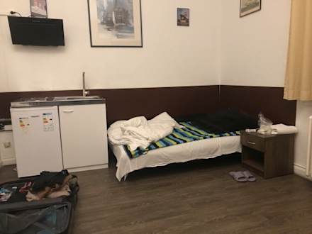 Disgusting, dirty room with a bed and a pull-out couch as the second 'bed'