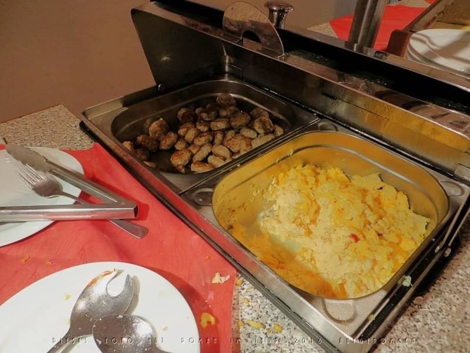 Frühstücksei, hier als Rührei neben Bouletten
