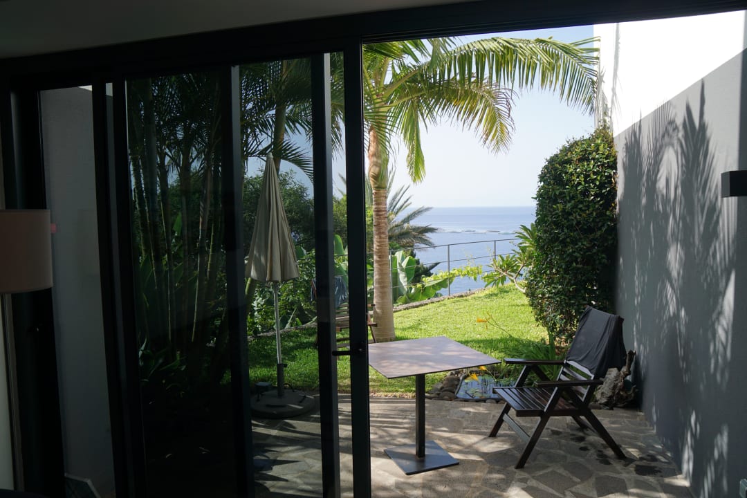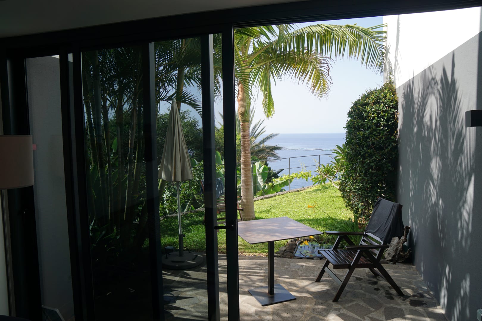 Blick aus dem Wohnbereich auf die Terasse