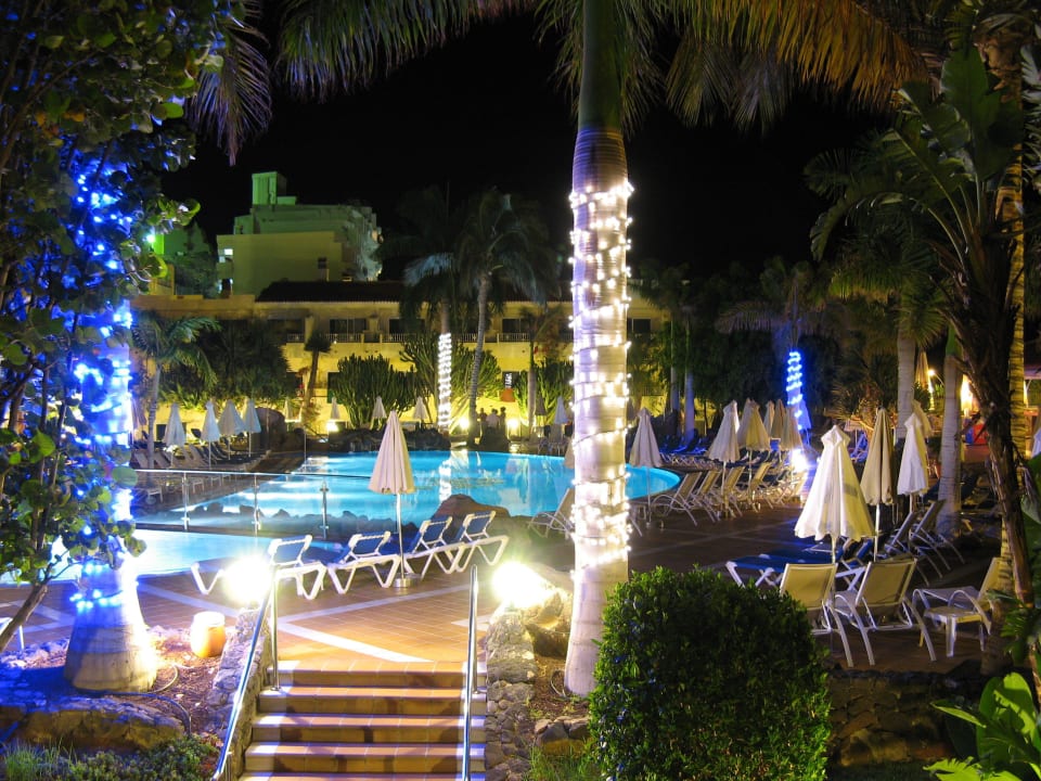 Blick auf Garten und Pool um Mitternacht