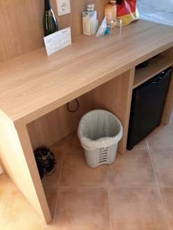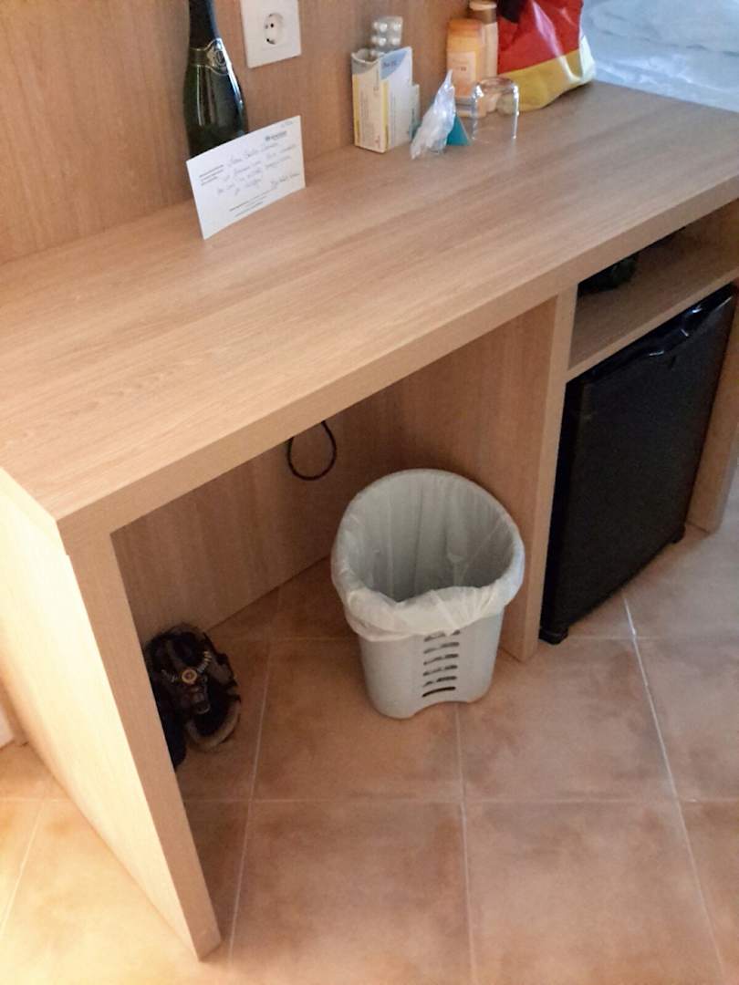 Zimmerder neue Schreibtisch mit Kühlschrank im Eingangsbereich.