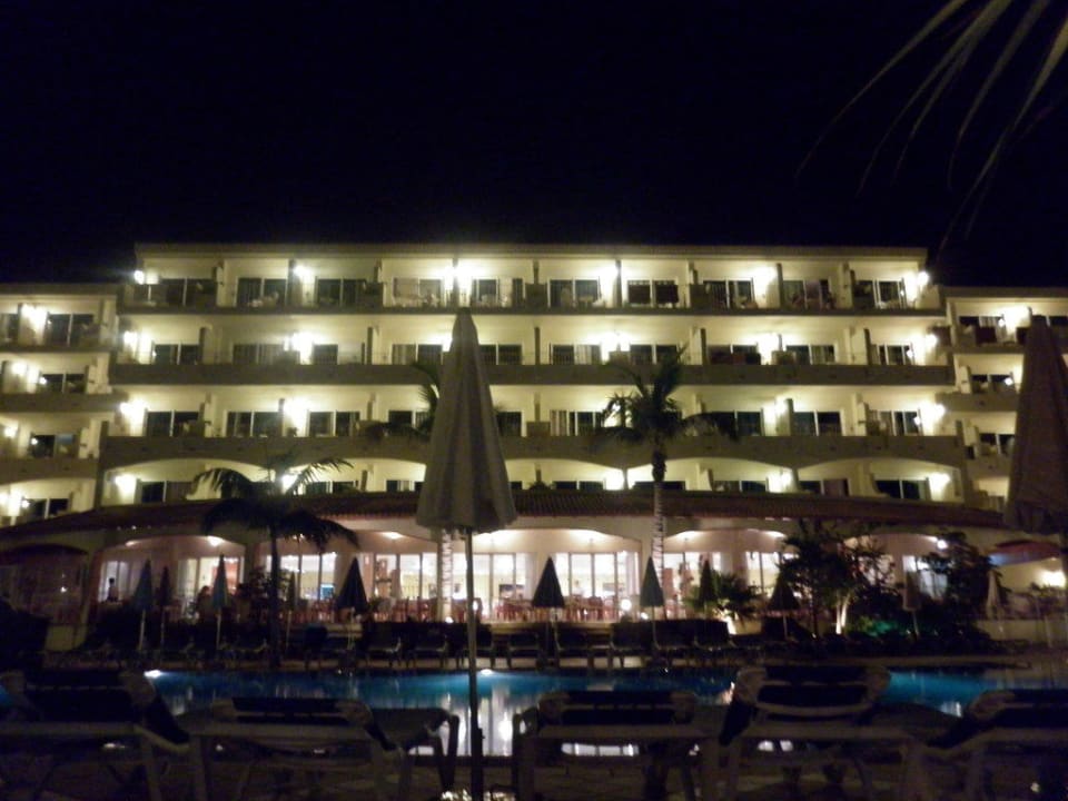 Hauptgebäude bei Nacht vom Pool aus