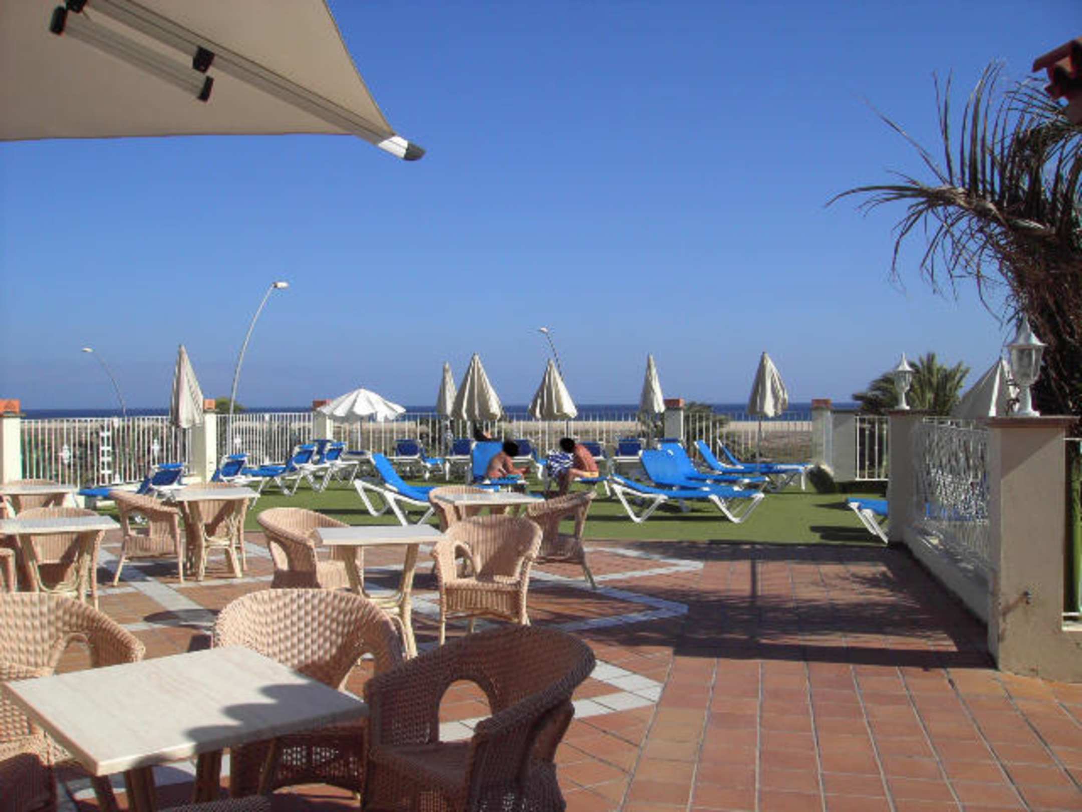 Sonnenterrassegleich hinter den Sitzgelegenheiten ist die mit Kunstrasen ausgelegte Sonnenterasse (windig). Die dort stehenden Schirme fielen durch Windböhen öfters um und waren manchmal eine echte Gefahrenquelle - AUFPASSEN! Bild wurde während des Abendessens aufgenommen - tagsüber war es VOLL!
