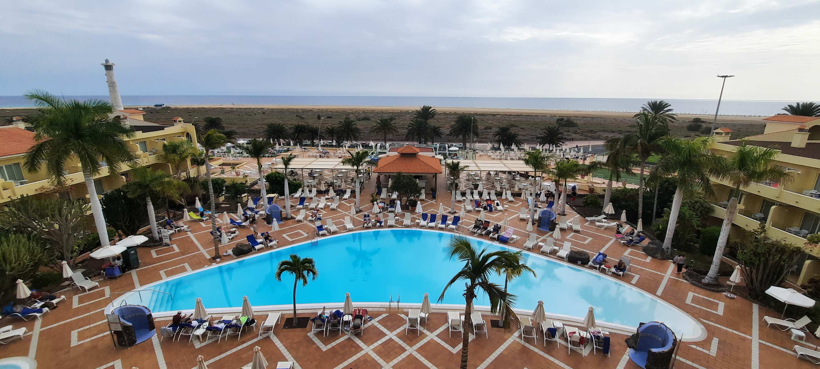 vom Zimmer auf den Pool und den Strand